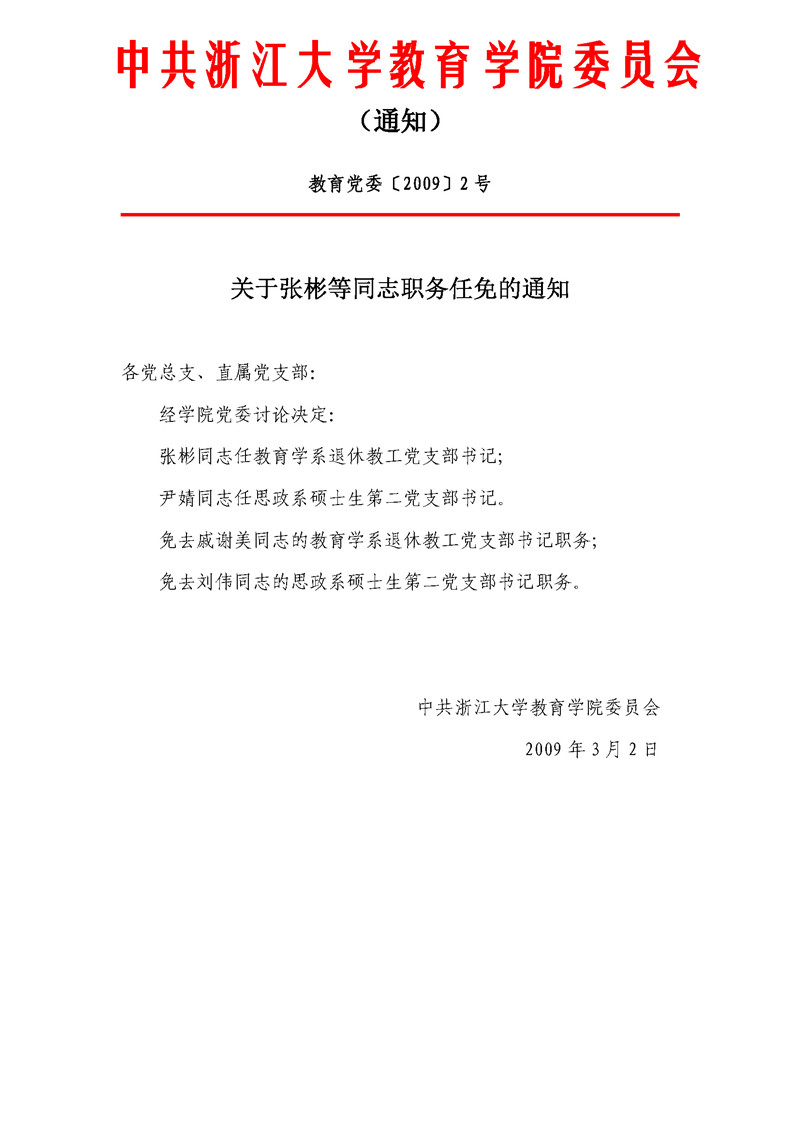 教育党委〔2009〕2号:关于张彬等同志职务任免的通知