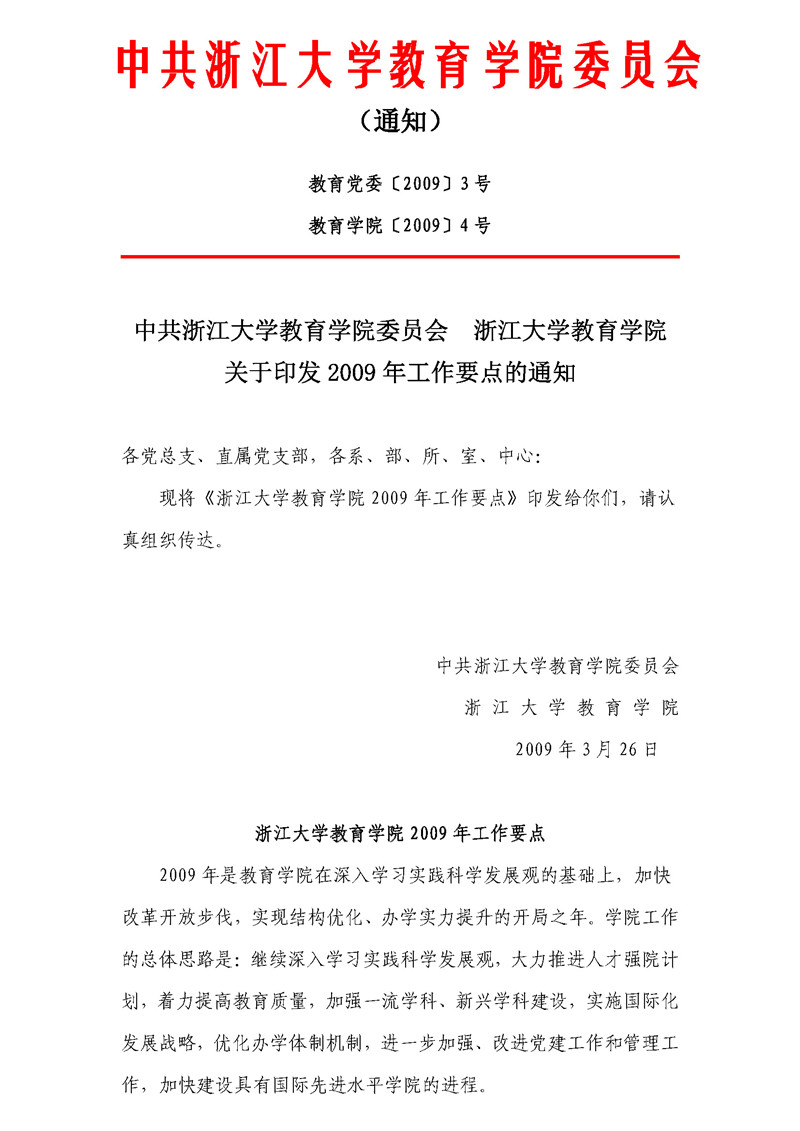 教育党委〔2009〕3号:中共浙江大学教育学院委员会 浙江大学教育学院关于印发2009年工作要点的通知