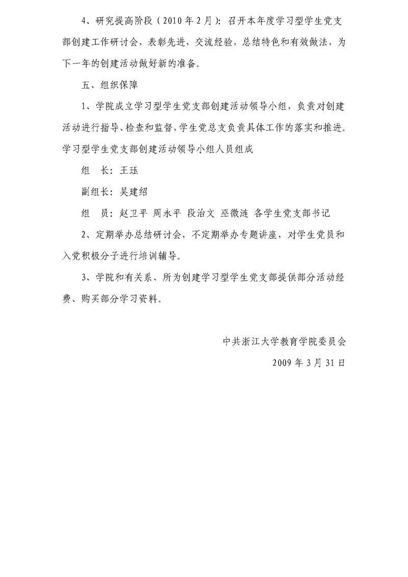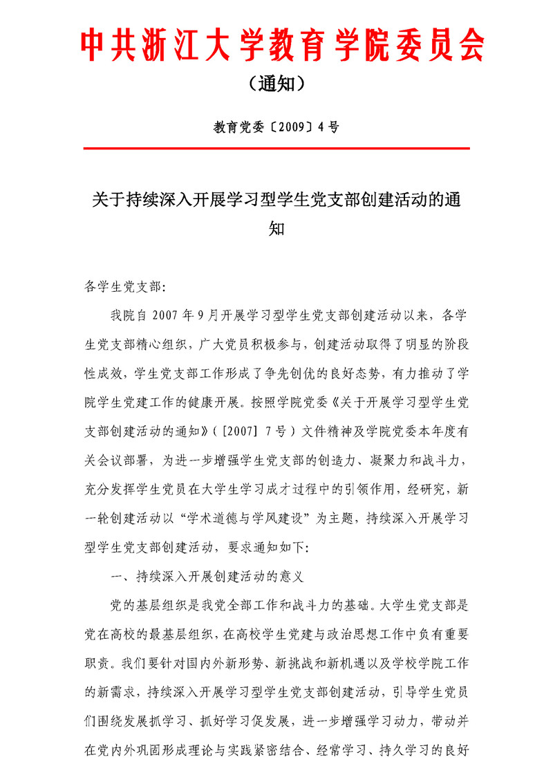 教育党委〔2009〕4号:中共浙江大学教育学院委员会关于持续深入开展学习型学生党支部创建活动的通知