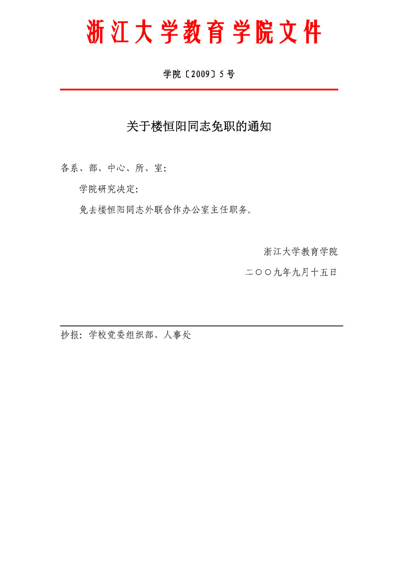 学院〔2009〕5号 关于楼恒阳同志免职的通知