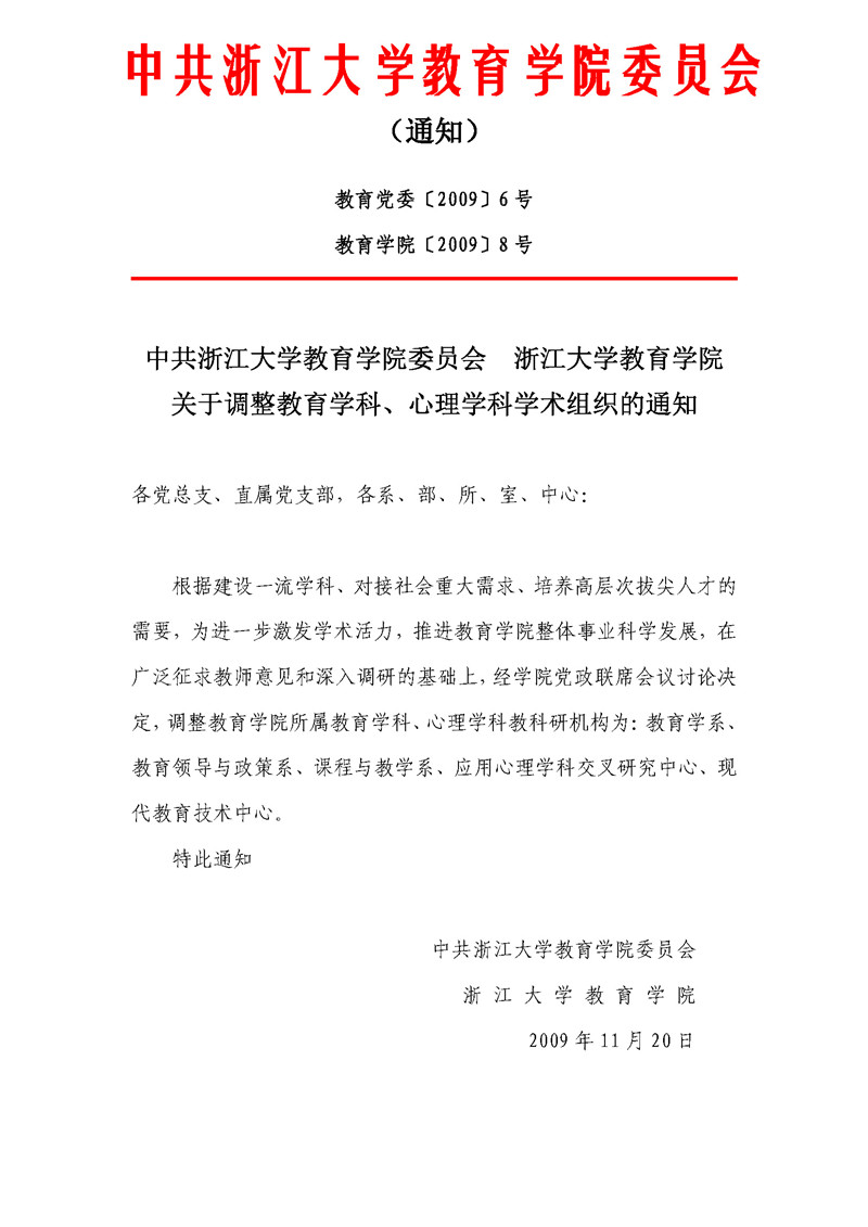 学院〔2009〕8号 中共浙江大学教育学院委员会 浙江大学教育学院关于调整教育...