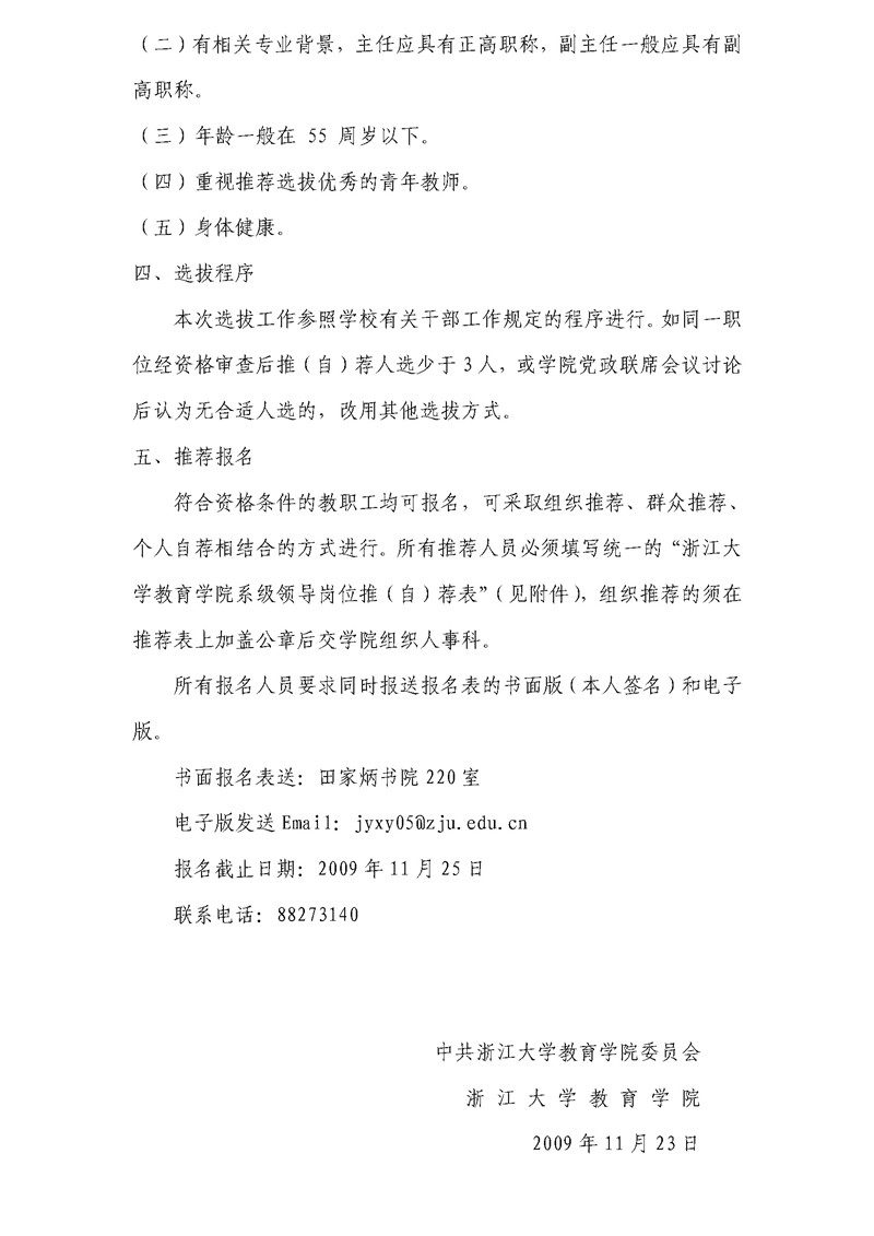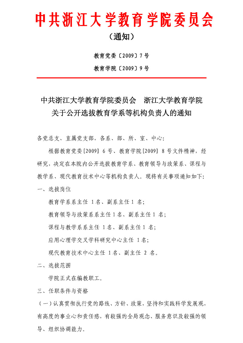 学院〔2009〕9号 中共浙江大学教育学院委员会 浙江大学教育学院关于公开选拔...
