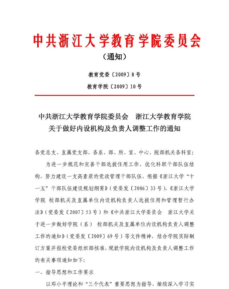 学院〔2009〕10号:中共浙江大学教育学院委员会 浙江大学教育学院关于做好内...