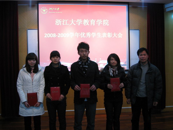 2010年1月7日晚,在宏亮的国歌声中,浙江大学教育学院2008年—2009学年优秀学生表彰大会在西溪校区田家炳书院520报告厅隆重举行。教育学院党委书记许迈进、副院长于可红、党委副书记王珏、教育系党总支书记赵卫平、体育系党总支副书记周永平、团委书记吴建绍、团委副书记余俊帅以及学院各年级兼职辅导员出席了会议。参加会议的还有08—09学年各类奖学金、荣誉称号获得者代表,学院博士生、硕士生、本科生各班级代表。