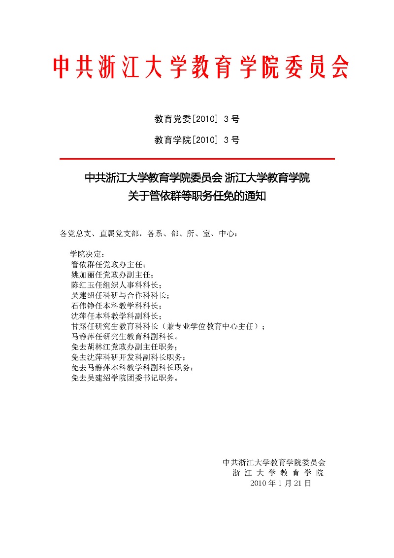 教育党委〔2010〕3号:中共浙江大学教育学院委员会 浙江大学教育学院关于管依群等职务任免的通知