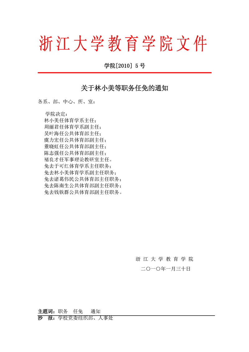 学院〔2010〕5号:浙江大学教育学院关于林小美等职务任免的通知