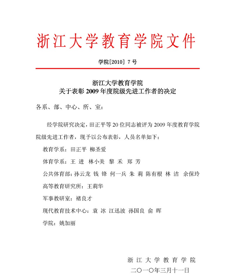 学院〔2010〕7号:学院关于表彰2009年度院级先进工作者的决定