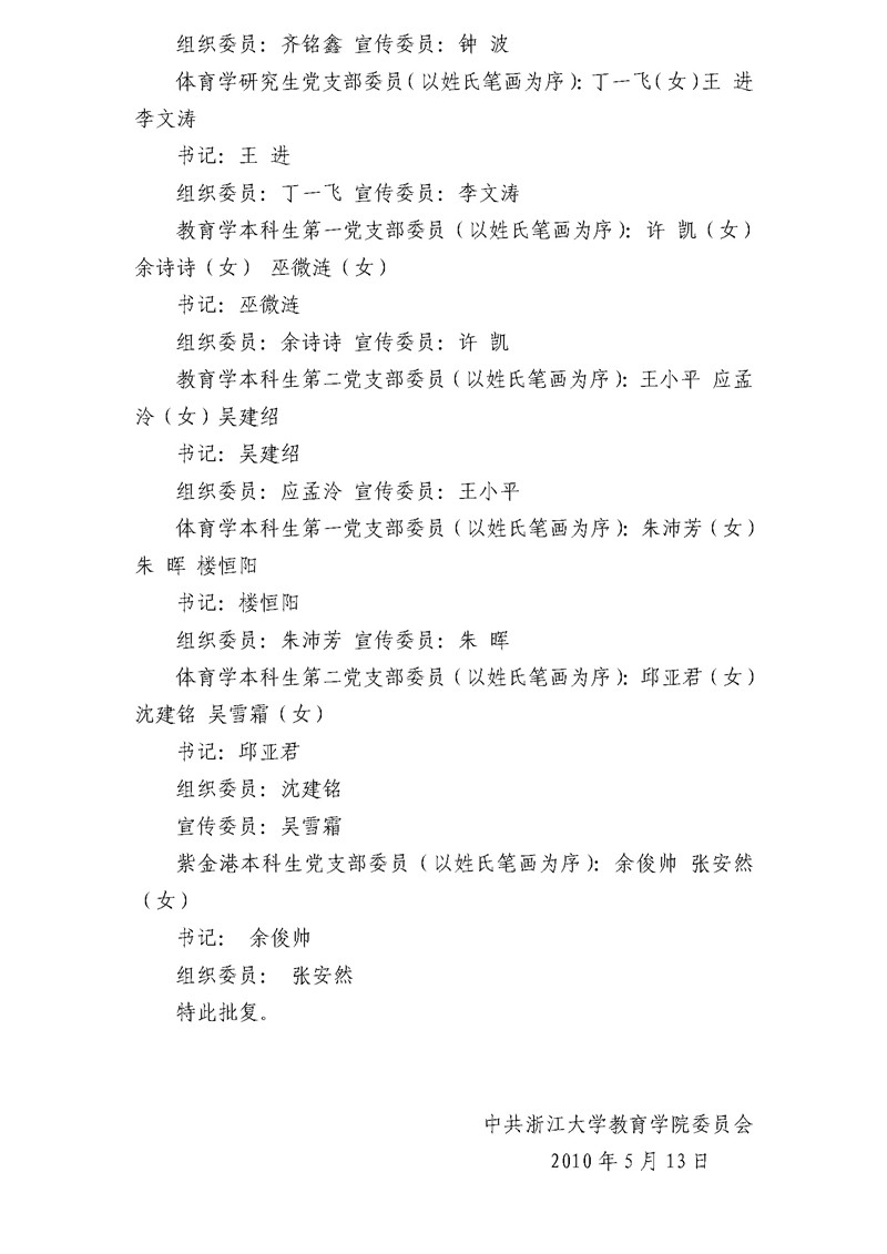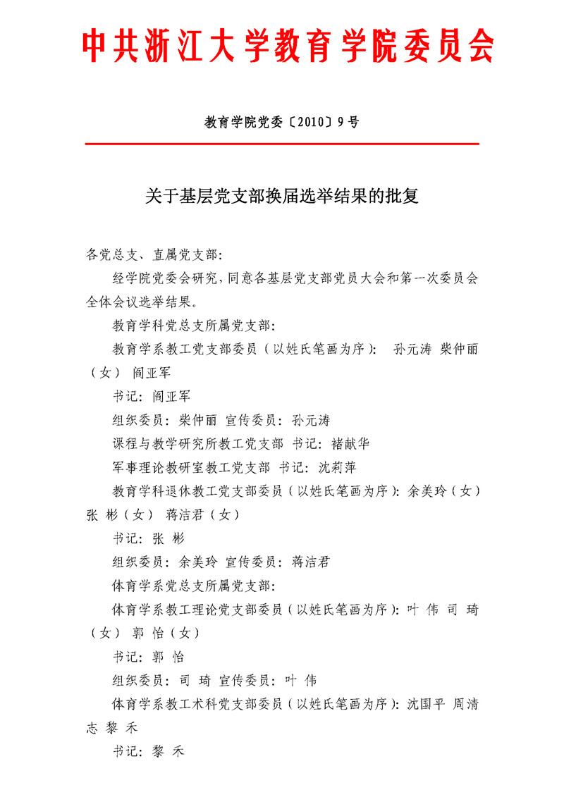 教育党委〔2010〕9号:关于基层党支部换届选举结果的批复