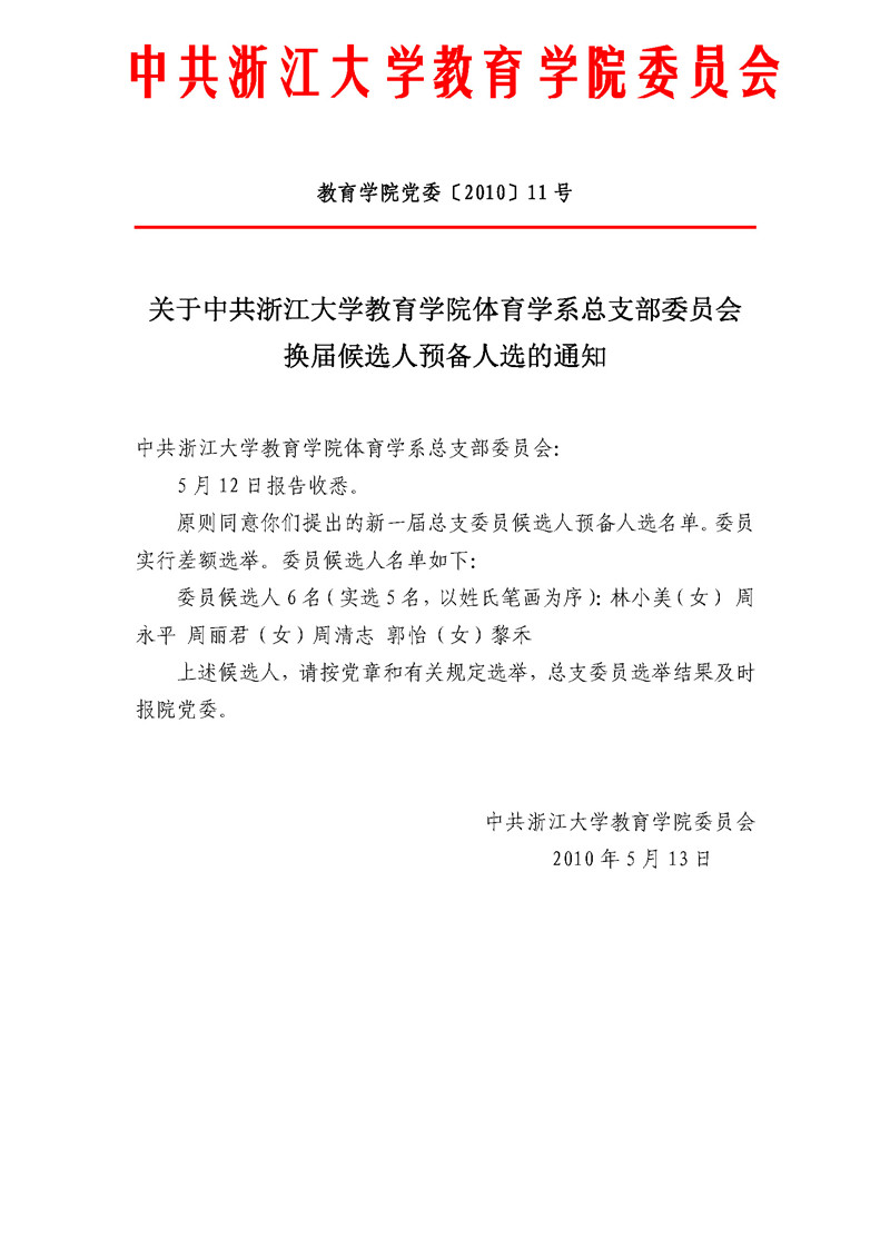 教育党委〔2010〕11号:关于中共浙江大学教育学院体育学系总支部委员会换届候选人预备人选的通知