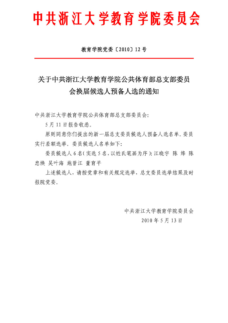 教育党委〔2010〕12号:关于中共浙江大学教育学院公共体育部总支部委员会换届候选人预备人选的通知