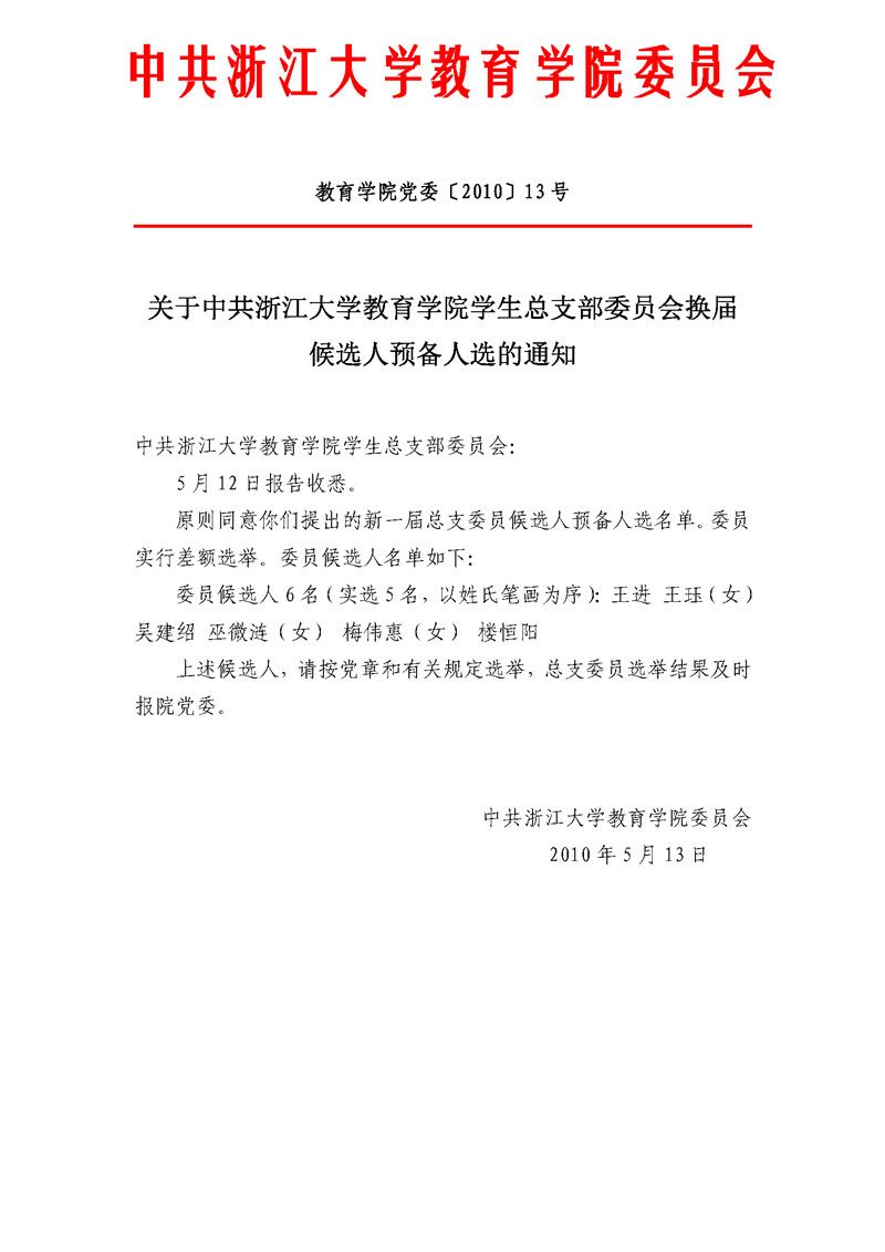 教育党委〔2010〕13号:关于中共浙江大学教育学院学生总支部委员会换届候选人预备人选的通知