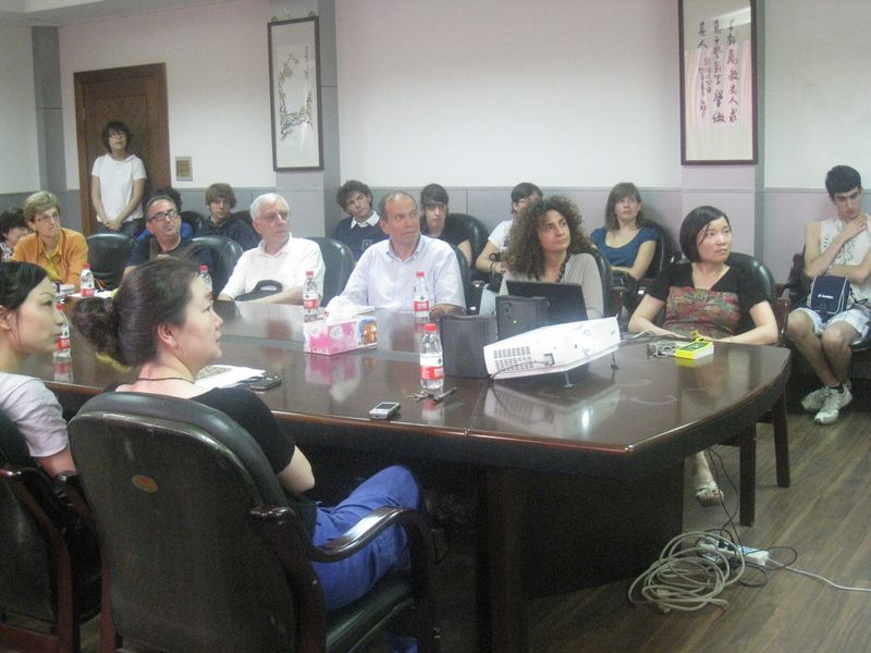 在上午的参观中,意大利师生重点了解了浙江大学教育学院实验基地——京都小学的艺术教育特色。京都小学坐落于京杭大运河畔、艮山门旁。2008年,原东园小学流水校区划归京都小学,成立京都教育集团学校。同年,学校被命名为浙江大学教育学院实验小学。通过ppt以及录像,学校副校长洪俊老师向意大利师生介绍了学校校本课程——版画、泥塑、昆曲、剪纸等开展的具体情况。意大利师生对京都小学中艺术教育的开展情况十分感兴趣,并提问到:根据他们的原有观念,在中国,学生升学压力很大,对分数的重视会导致音乐美术等许多课程遭到忽视;那么,京都小学是如何保证学校艺术教育的数量与质量的呢?