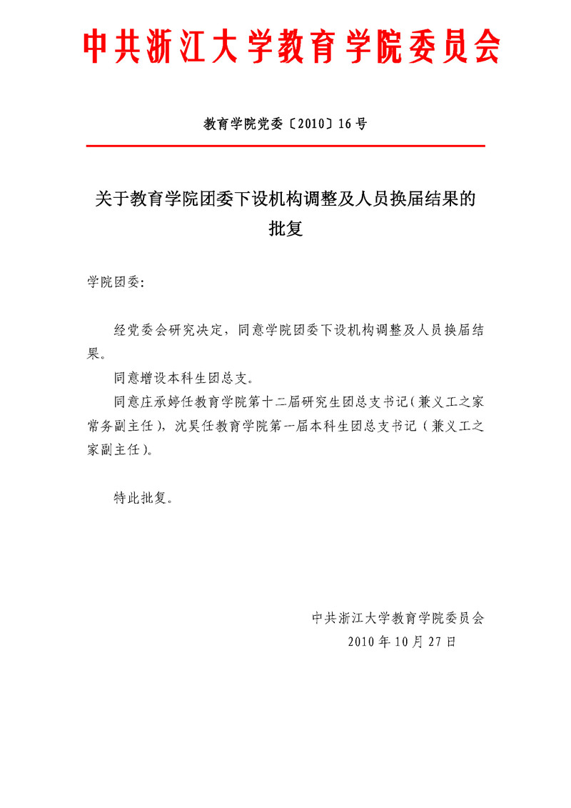 教育党委〔2010〕16号:关于教育学院团委下设机构调整及人员换届结果的批复