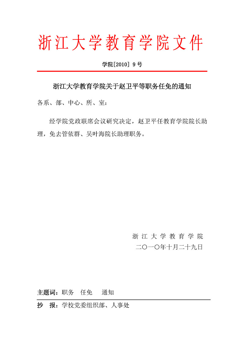 学院〔2010〕9号:浙江大学教育学院关于赵卫平等职务任免的通知