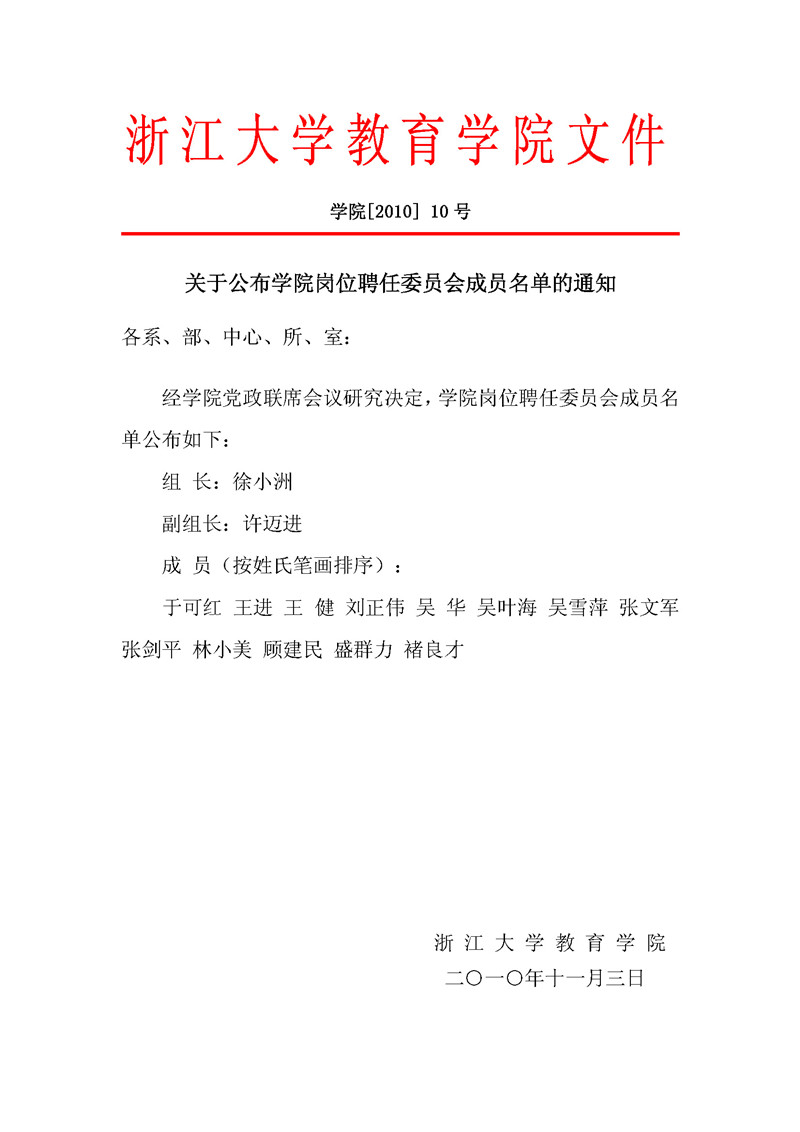 学院〔2010〕10号:关于公布学院岗位聘任委员会成员名单的通知
