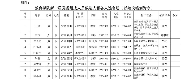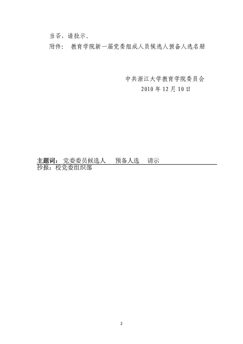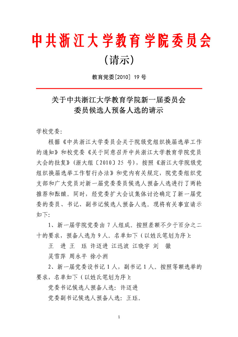 教育党委〔2010〕19号:关于中共浙江大学教育学院新一届委员会委员候选人预备人选的请示