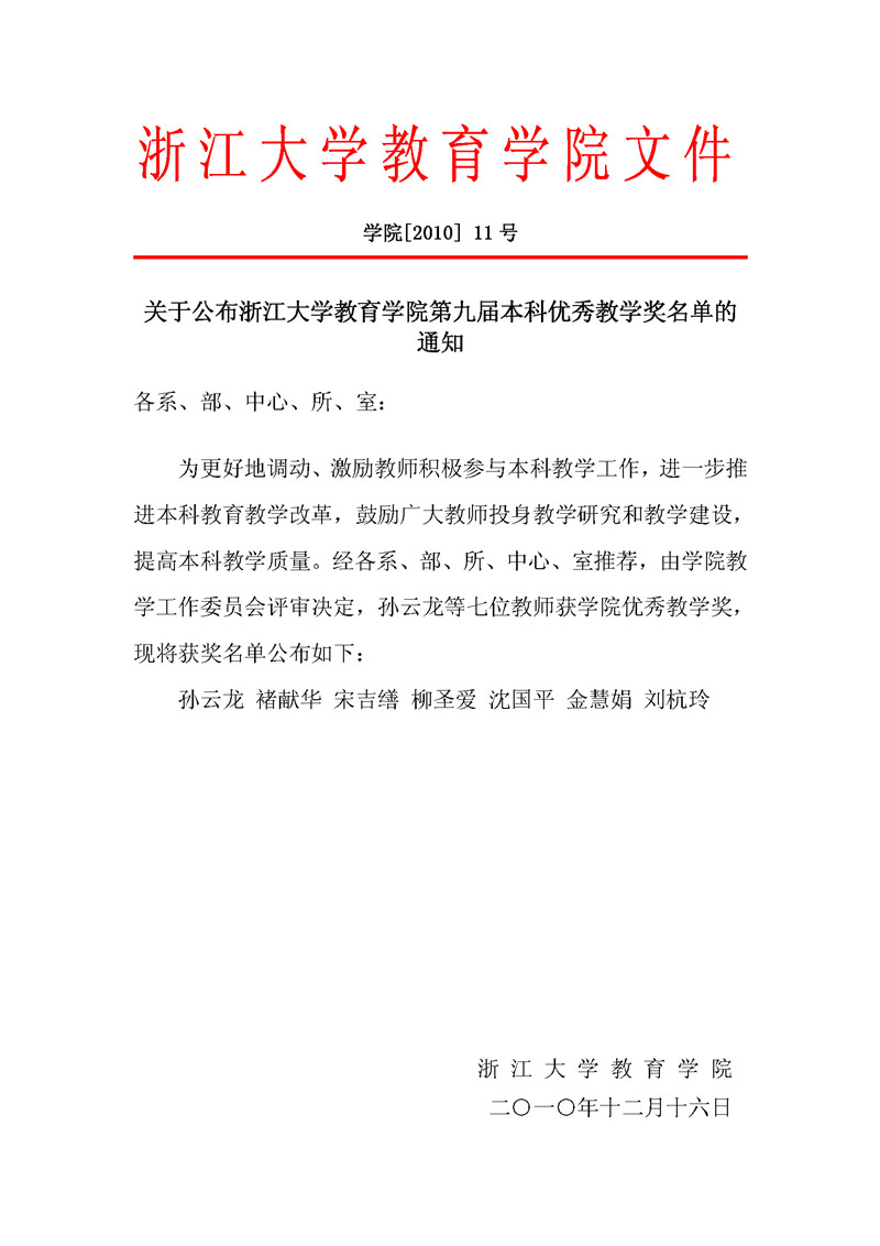 学院〔2010〕11号:关于公布浙江大学教育学院第九届本科优秀教学奖名单的通知
