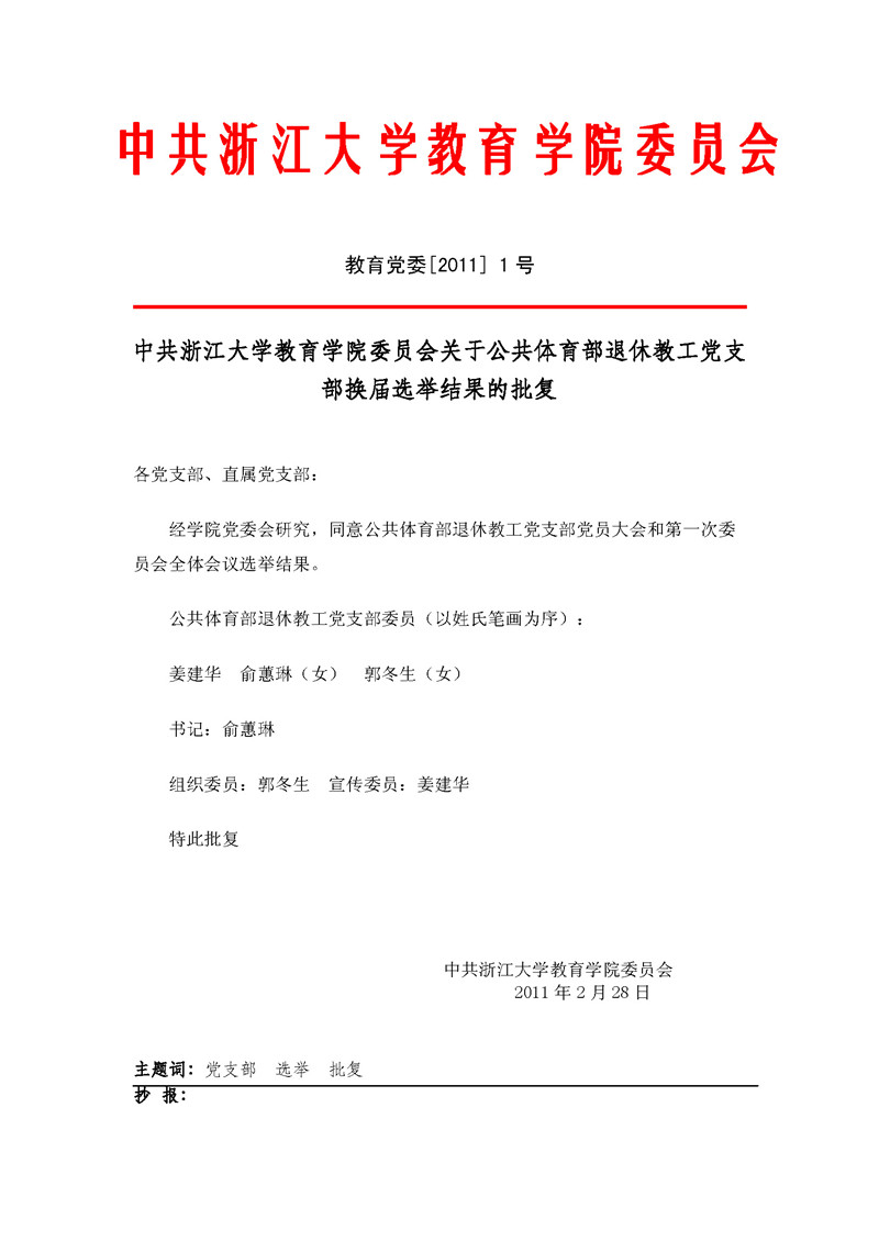 教育党委〔2011〕1号:中共浙江大学教育学院委员会关于公共体育部退休教工党支部换届选举结果的批复