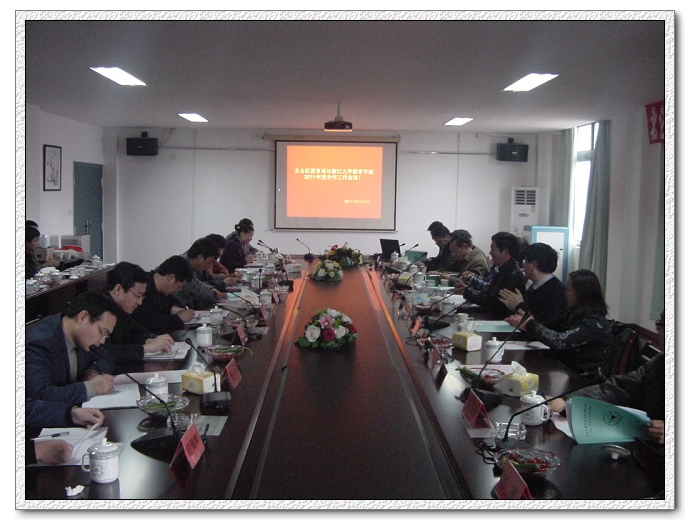 会上,胡小伟局长首先对两年来双方在“建立基地、组织培训、课题研究、学校打造”等方面的合作成效表示肯定,并希望在“十二五”开局之年在总结借鉴两年多来合作经验的基础上将双方的合作推向一个新的高度。随后,徐小洲院长也作了重要讲话,他首先感谢合作两年来北仑区教育局及各相关学校给予的支持,接着他着重介绍了国内外区域合作研究的发展形势,并围绕北仑教育现代化强区的建设阐述了2011年双方合作重点,提出了2011年工作思路、策略和预期成果。北仑区俞斌副局长总结了自2009年来双方合作的具体情况,提出今年要最大限度地调动双方优质资源与专业力量,不断深化、优化双方合作进程,取得更大的合作成效。最后,刘正伟副院长简要介绍了双方确定的2011年11项合作内容,包括北仑教育系统后备干部培训、校本课程研发、基地建设、区域性课题研究、实验学校指导、先进经验总结、教育信息化建设、完善发展规划等方面。