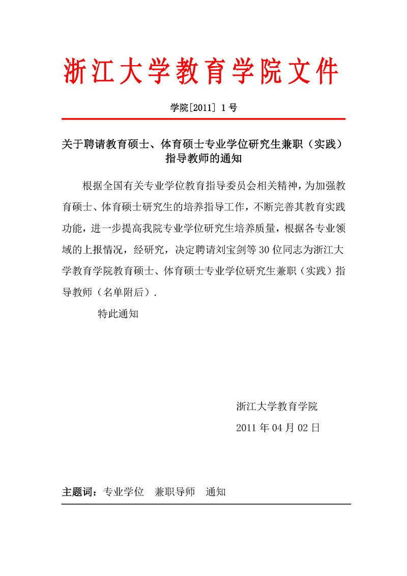 学院〔2011〕1号:关于聘请教育硕士、体育硕士专业学位研究生兼职(实践)指导教...