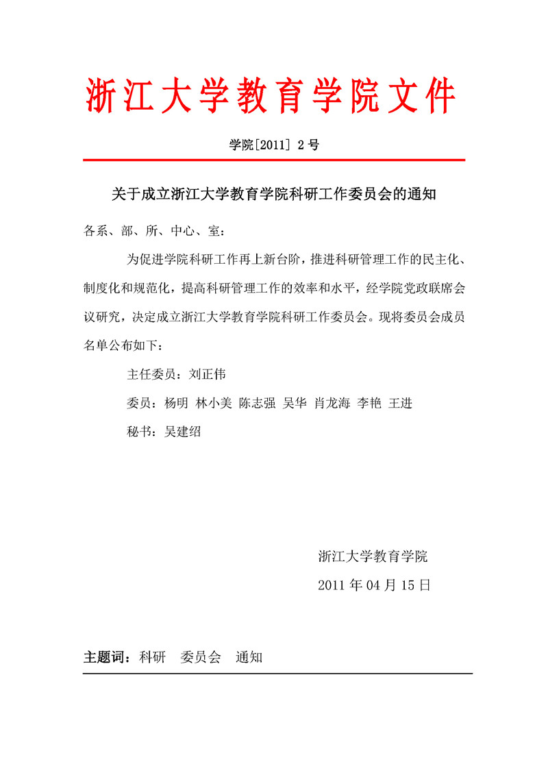 学院〔2011〕2号:关于成立浙江大学教育学院科研工作委员会的通知