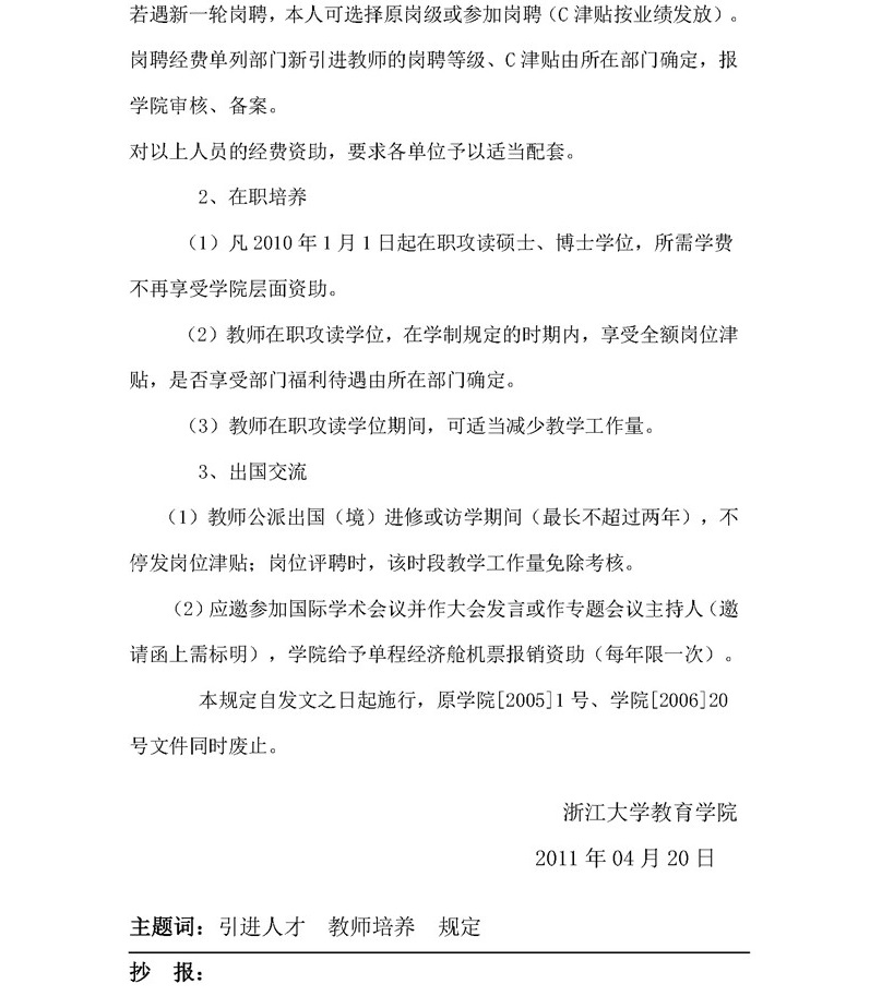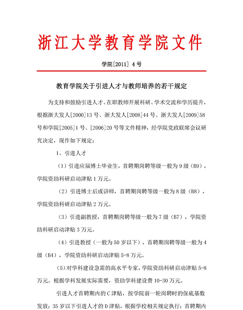 学院〔2011〕4号:教育学院关于引进人才与教师培养的若干规定