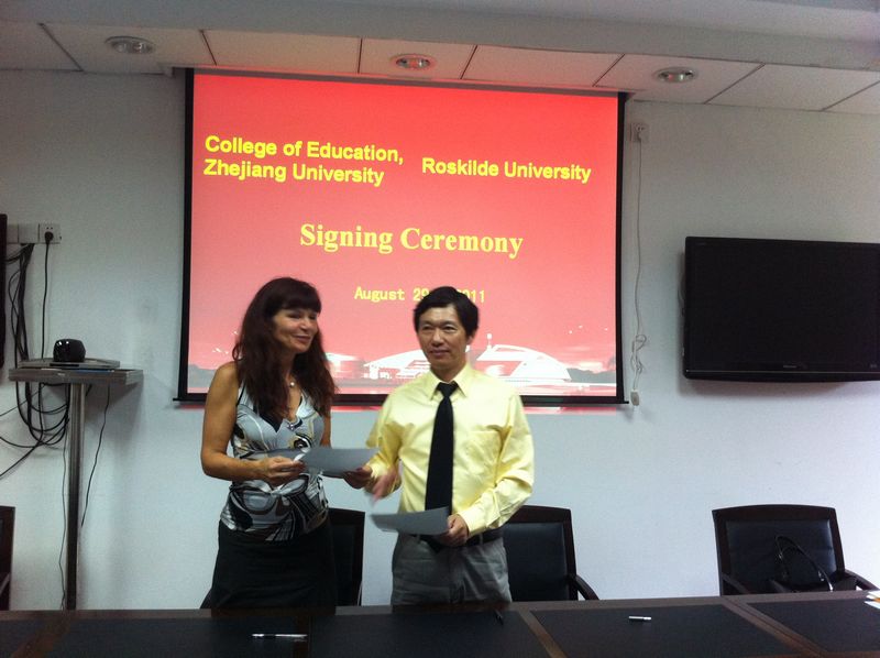 徐小洲教授代表学院对西兰岛大区代表团一行的到来表示热烈欢迎。徐院长首先介绍了学院的基本概况、学科设置、教学科研特色、人才培养和国际交流合作等情况,并回顾了我院和罗斯基尔大学的交流与合作。Jens Andersen则对丹麦西兰岛大区的基本情况做了简单介绍。随后,罗斯基尔大学副校长Andersen和西兰岛大学院院长Koch分别就罗斯基尔大学和西兰岛大学院的学科设置、课程选择、人才培养、国际交流等方面做了重点交流,双方在可合作的相关领域展开了详细的交流和讨论。经过商议讨论,浙江大学教育学院和罗斯基尔大学签署了交流合作协议,双方将在师生互换项目、共同开展科研与合作,共同举办国际会议及开拓E-Learning、ICT领域的合作达成了共识。