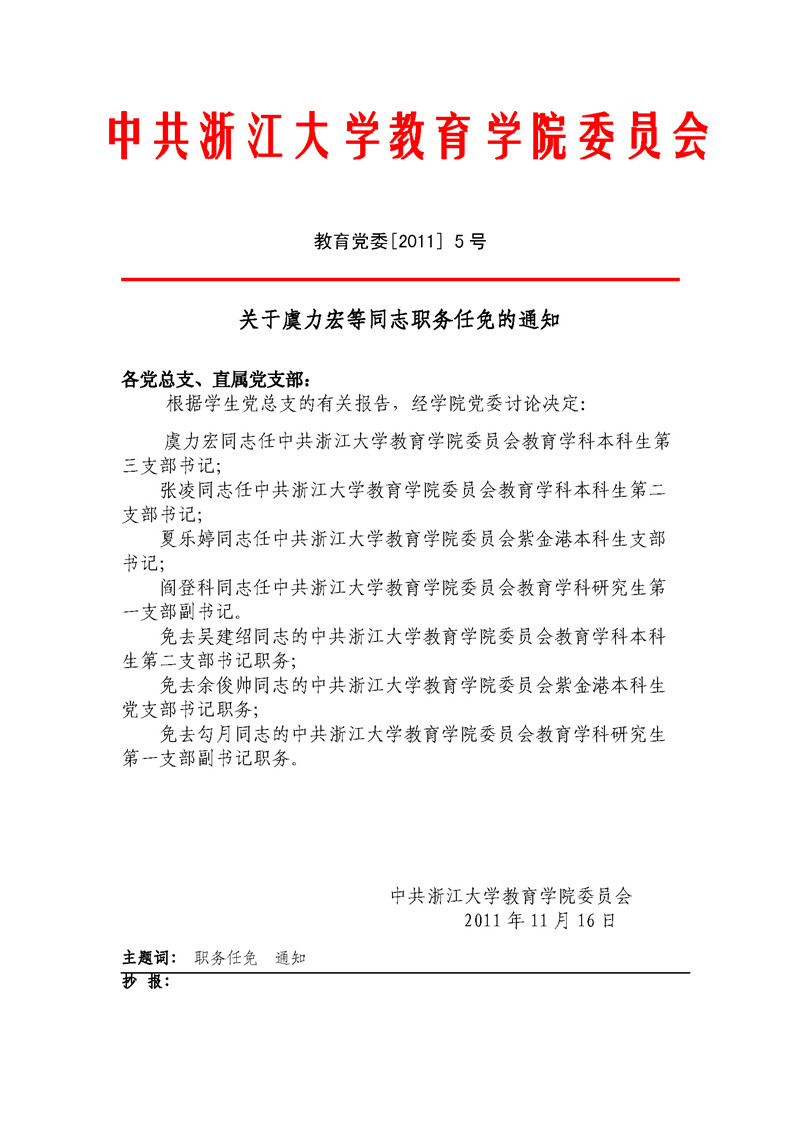 教育党委〔2011〕5号:关于虞力宏等同志职务任免的通知