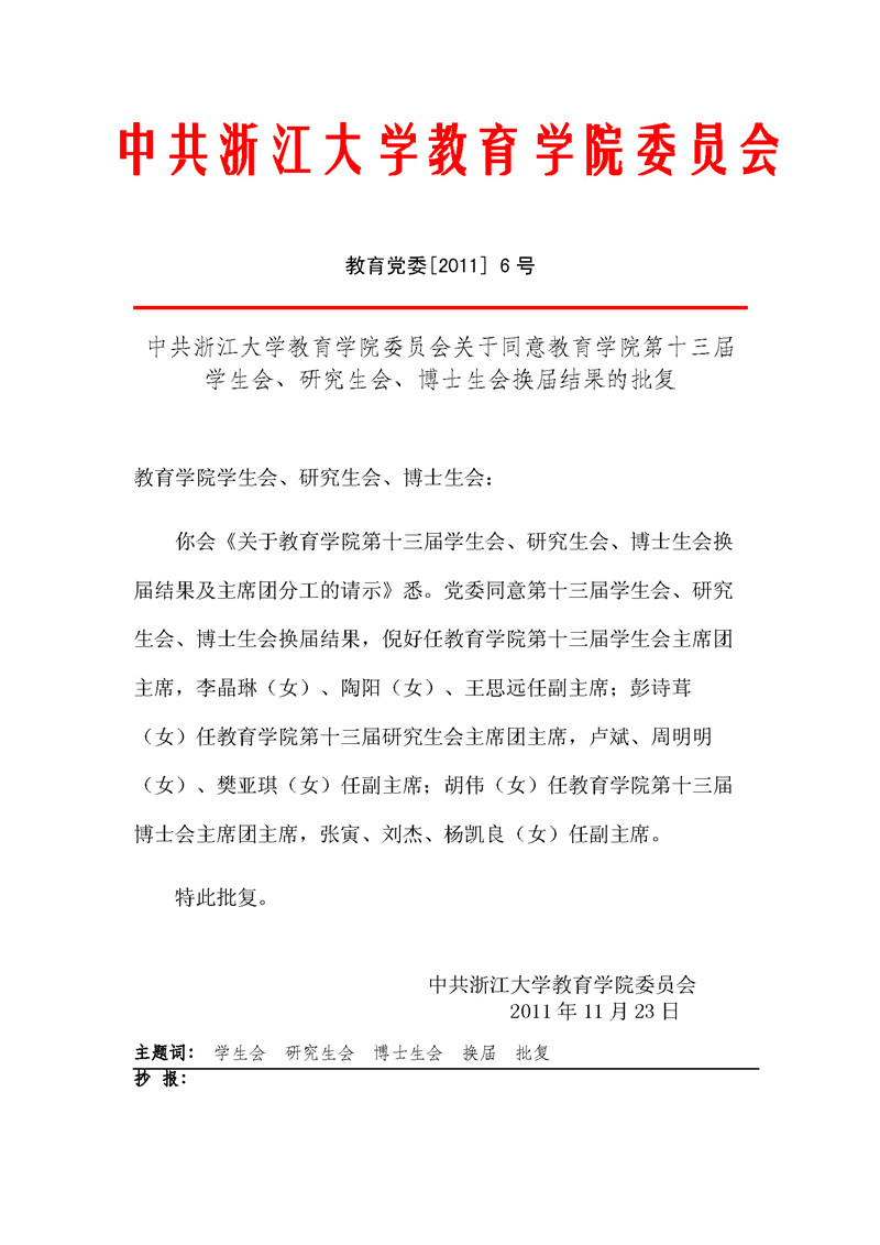教育党委〔2011〕6号:中共浙江大学教育学院委员会关于同意教育学院第十三届学生会、研究生会、博士生会换届结果的批复