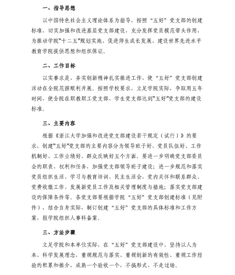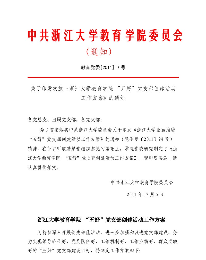 教育党委〔2011〕7号:关于印发实施《浙江大学教育学院 “五好”党支部创建活动工作方案》的通知