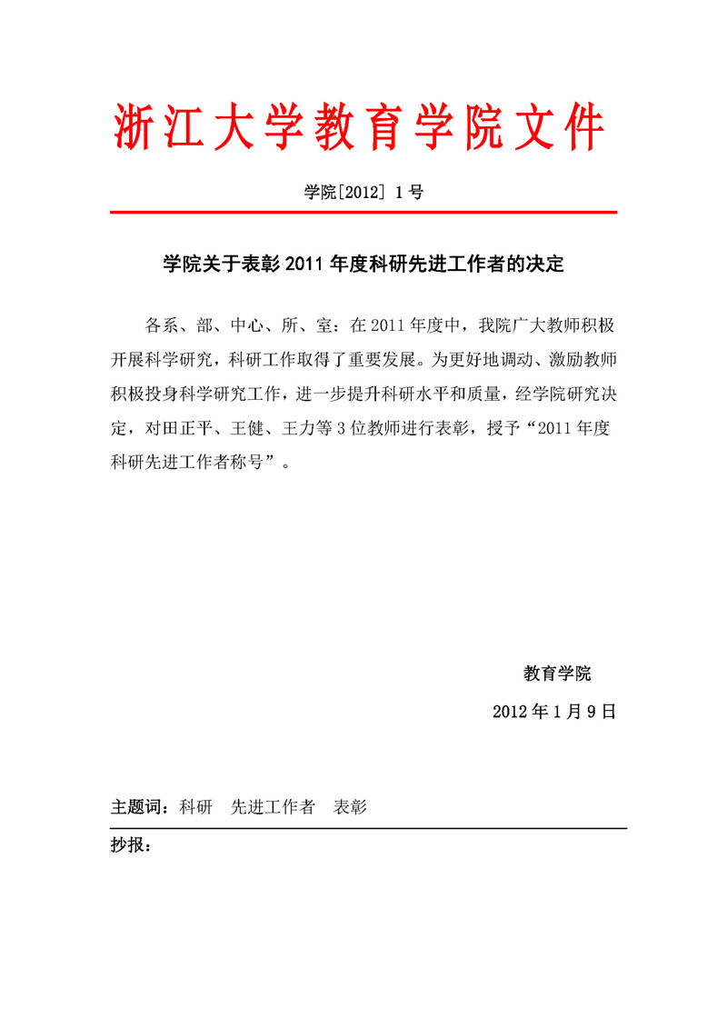 学院〔2012〕1号:学院关于表彰2011年度科研先进工作者的决定