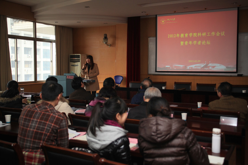 2012年1月9日,教育学院科研工作会议暨青年学者论坛在田家炳书院520学术报告厅隆重召开。浙江大学罗卫东副校长、教育学院徐小洲常务副院长、教育学院许迈进书记、社会科学研究院袁清部长、公管学院余潇枫教授以及教育学院副院长顾建民、副院长刘正伟、副书记王珏等领导和师生共100余人参加了会议。会议分为三个部分:开幕式及颁奖、专家报告和青年学者论坛。