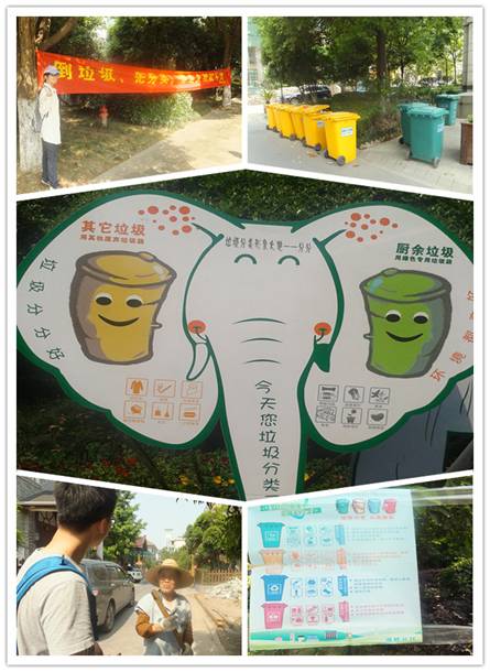 在调研活动中,义工同学们调查了湖畔花苑、雅士苑、金成花园、紫桂花苑、骆家庄东苑、新金都社区、恩泽花园等7大社区,询问了居委会或物业的工作人员、居民、保安、环卫工人等相关人员。可以看到,不同社区的垃圾分类工作开展状况参差不齐:有的社区垃圾分类设施齐全,垃圾分类的标语和横幅随处可见,居民们基本上能自行将垃圾分成厨房垃圾和其他垃圾两类,并用两种不同颜色的塑料袋将两种垃圾进行分装,分别扔入对应的垃圾桶,环保意识较强。有些社区虽在之前曾尝试过开展垃圾分类,但由于社区内居民成分复杂,垃圾分类工作很难落实,故并未持续下去。