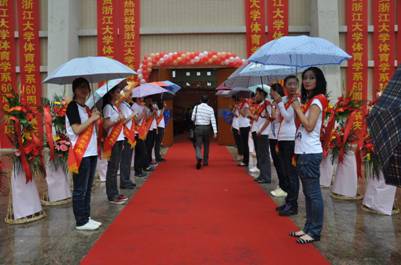 为营造融洽温馨、宾至如归的气氛,体育学系系庆筹委会作了精心安排。会场从签到处的设置到纪念礼品袋的摆设,从引导员的列队到会场桌椅的安放,从红地毯的铺设到会场灯光的调试等都进行了悉心设计。整个会场明亮温馨,舞台华丽闪亮,迎宾乐曲引人入胜,综合馆被一股浓浓的“节日”气息和“回家”的感觉包围着,与会人员都沉浸在这一美好时刻中。