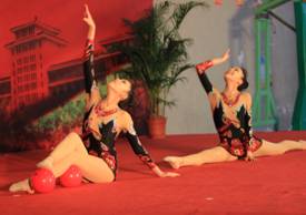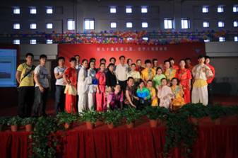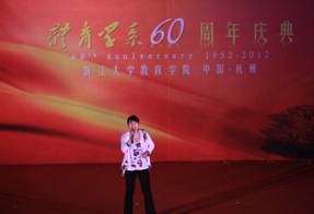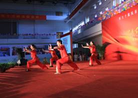 师生同庆是本次汇演的主题之一,当体育学系教师代表薛奎的一曲《精忠报国》把全场带回庄严肃穆的气氛时,求是小学小朋友们的武术健身操《旭日东升》又让全体与会人员感受到了体育的魅力和活力。这组武术健身操是我系“阳光义工”小组,结合武术基本套路和小学生的身心特点,在第十套中小学生广播体操的基础上改编而来的,是推广我国民族传统体育文化的一次全新尝试。