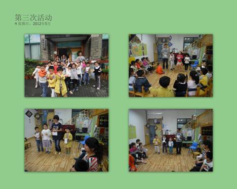 一周之后,即2012年5月25日,为迎接六一国际儿童节的到来,阳光义工计划西溪幼儿园项目组又组织了一批义工前往西溪幼儿园,协助幼儿园老师进行节日前的活动布置工作。3名义工分工合作,将打印好的彩色图片进行分割和塑封,做成简易拼图。这是我们为小朋友准备的礼物,集娱乐和益智于一体。由于是精细的手工活,每个义工做得都格外认真和仔细。之后,义工们还和小朋友一起玩游戏,活动结束后,义工们纷纷发来活动感想,一致认为我们做的工作虽然简单,但还是收获良多。小朋友的活泼、纯真,以及对我们的无偿的信任感让我们觉得很幸福。义工们纷纷表示希望以后能和这些小朋友有更多的接触和了解。