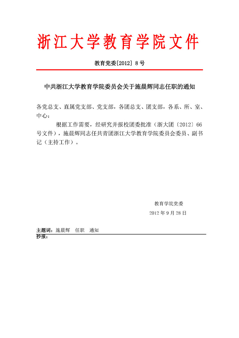 教育党委〔2012〕8号:中共浙江大学教育学院委员会关于施晨辉同志任职的通知