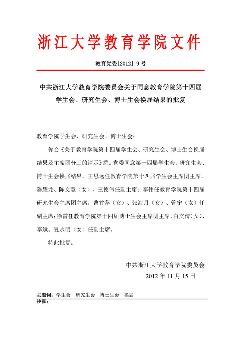教育党委〔2012〕9号:中共浙江大学教育学院委员会关于同意教育学院第十四届学生会、研究生会、博士生会换届结果的批复