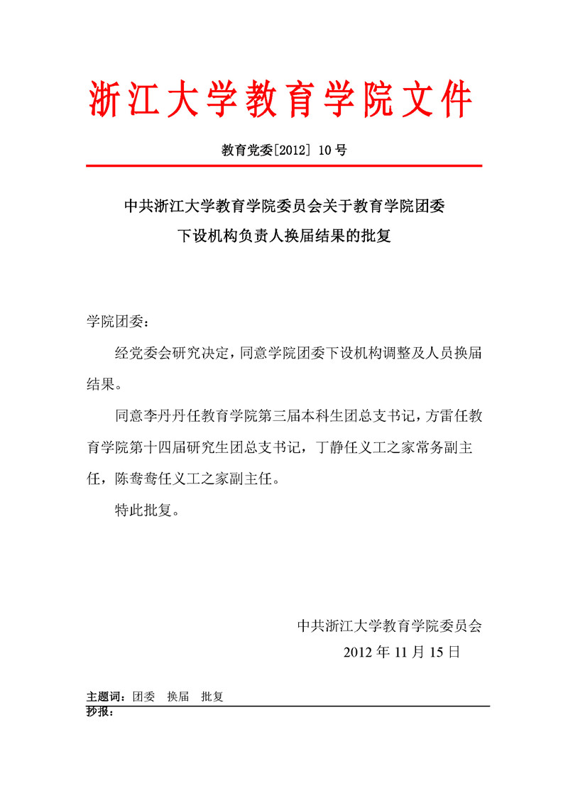 教育党委〔2012〕10号:中共浙江大学教育学院委员会关于教育学院团委下设机构负责人换届结果的批复