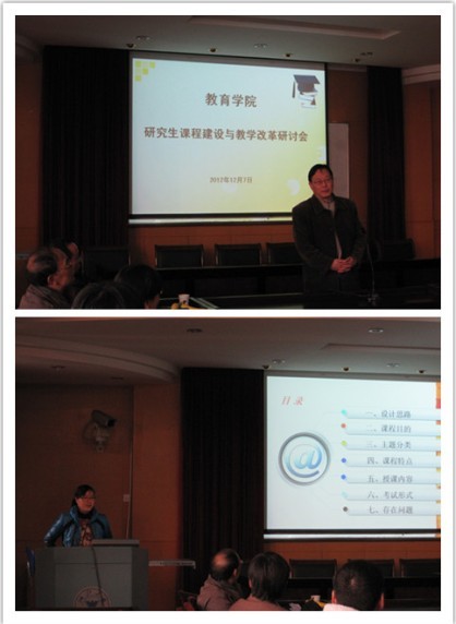郑芳教授以《互动、引导、探究——体育科学研究方法硕士生平台课教学汇报》为题从学情分析、教学内容与要求、教学方式、问题与建议等几个方面介绍了硕士生平台课《体育科学研究方法》;杨明教授以《加强学科渗透,提高综合素质》为题从教学要求、课程内容、教材选编、考核方式等几个方面介绍了硕士生平台课《教育科学导论》;吴雪萍教授汇报了比较教育专业研究生全英文课程建设的进展情况,认为通过全英文课程建设,有力地推动学科建设和国际合作。在经验交流的基础上,全体与会教师结合之前通过课后书面调查和座谈会收集的研究生对课程教学的意见和建议,就如何进一步改进和提高课程教学质量进行了研讨。