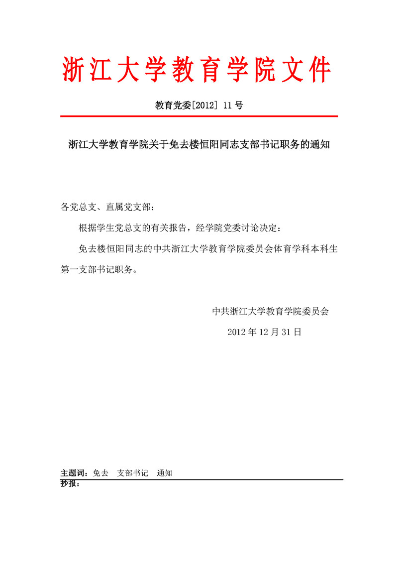 教育党委〔2012〕11号:浙江大学教育学院关于免去楼恒阳同志支部书记职务的通知