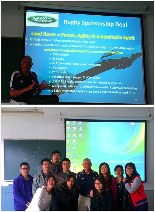 此次体育学系特邀其来访和讲学,旨在为体育产业与管理本科新专业学生《体育管理理论与实践》课程实践版块的学习提供国际化教学的新资源,讲座同时也向研究生们开放,鼓励各个学历层次的学生更多汲取国外优秀的体育管理实战经验,为今后专业、职业和事业发展积累宝贵财富。期间的全英文教学与交流,也使学生们获得了一次宝贵的与外教近距离交流的机会,对于营造体育学系英语学习氛围也极为有益。在四天里,John Shuttleworth博士与体育学系副主任周丽君博士合作,从Sport Management Ethics、Sport Governance、Sport Sponsorship、Work Sport & Leisure Relationship、Aviva Premiership & International Rugby Board Irb等方向,为体育学系的本科生、硕士生和博生做了系列讲座,每一场的氛围都十分热烈。体育赞助主题讲座尤为吸引学生关注,被评价为四期讲座中最精彩的一次。John Shuttleworth博士介绍了国外体育赞助广告和体育赞助方法,展示了大量充满灵感富有创意的体育广告视频,“让同学们对于体育赞助有了更直观的认识与新的思路”。此外,他还以Aviva公司为主赞助的橄榄球联赛为例,用大量视频展示了英式橄榄球运动的魅力。讲座结束后,John Shuttleworth博士与体育学系的师生合影留念,并为大家留下联系方式,方便今后的交流与学习探讨。