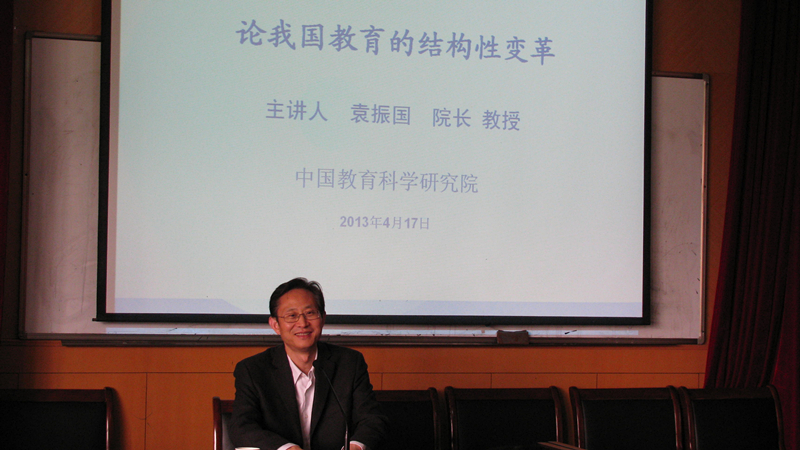 2013年4月17日下午,中国教育科学学院院长袁振国教授应邀来教育学院讲学,为参加2012年浙江省中小学浙派名师名校长培养工程浙大培训项目的40位中学校长带来题为“论我国教育的结构性变革”的精彩讲座。