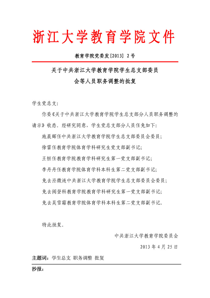 教育学院党委发〔2013〕2号:关于中共浙江大学教育学院学生总支部委员会等人员职务调整的批复