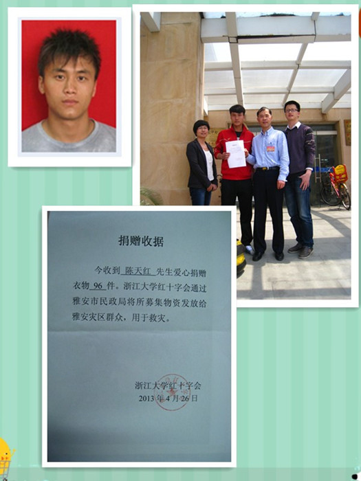 地震无情,人间有爱。雅安灾情又一次牵动了全国人民的心,包括我们学校和学院的师生,运动训练专业目前正休学创业的2010级本科生陈天红,当即从广州连线学院老师和同学,本周通过学校红会向灾区捐出了市价约一万元的衣物,“我相信学校,学校学院老师在我困难时帮了我,一起想办法,现在请帮我把这些衣物送给有需要的同学,或者算在整个学校的捐赠里”。
