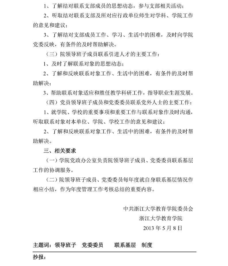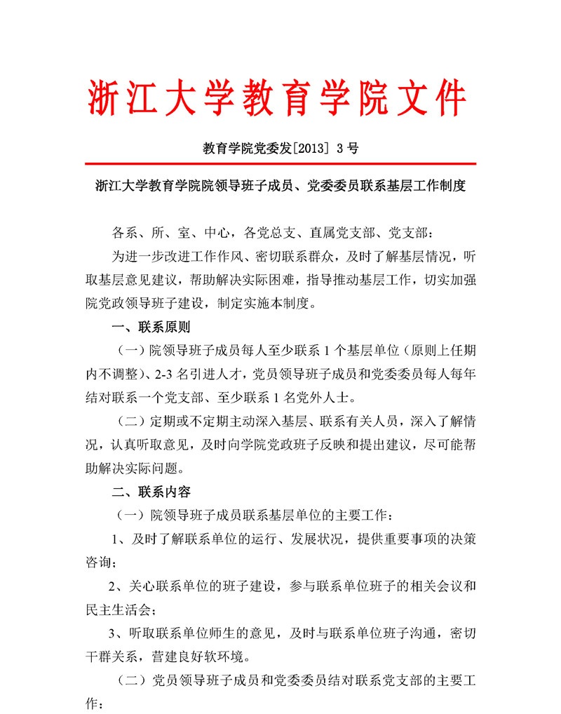 教育学院党委发〔2013〕3号:浙江大学教育学院院领导班子成员、党委委员联系基层工作制度