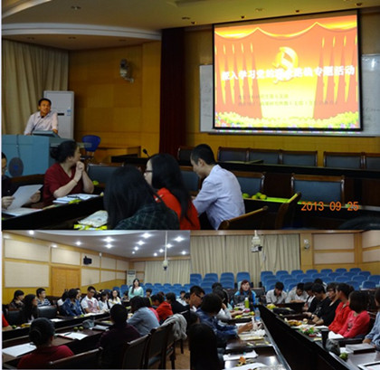 2013年9月25日晚,教育学科研究生第五支部在田家炳书院520会议室召开学习“党的群众路线”专题活动。学院党委书记张丽娜老师、党委副书记王珏老师,团委施晨辉老师,教育领导与政策研究所教工支部蓝劲松老师、汤成老师以及公共事业管理(体育方向)本科生代表共约30人共同参加此次活动。会议由本支部书记邵兴江老师主持。