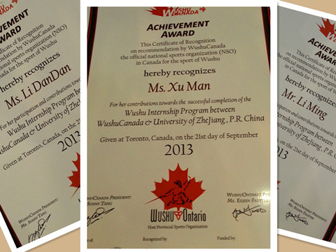 实习期间,恰逢邓华咏春武术学院四十周年庆典和国际奥比斯眼科飞行医院慈善活动的举行,实习生们也有幸参加了这两个活动的组织和表演。鉴于实习成员在两个月的认知实践活动中对中国文化的积极传播,以及为促进加拿大武术发展所付出的努力,加拿大多伦多议员Jim Karygiannis 先生特别为实习成员颁发“加拿大与浙江大学武术文化交流项目荣誉证书”,加拿大武术团体联合总会为带队教师和实习成员颁发了“浙江大学与加拿大武术实习项目贡献奖”和“浙江大学与加拿大武术实习项目参与奖”。