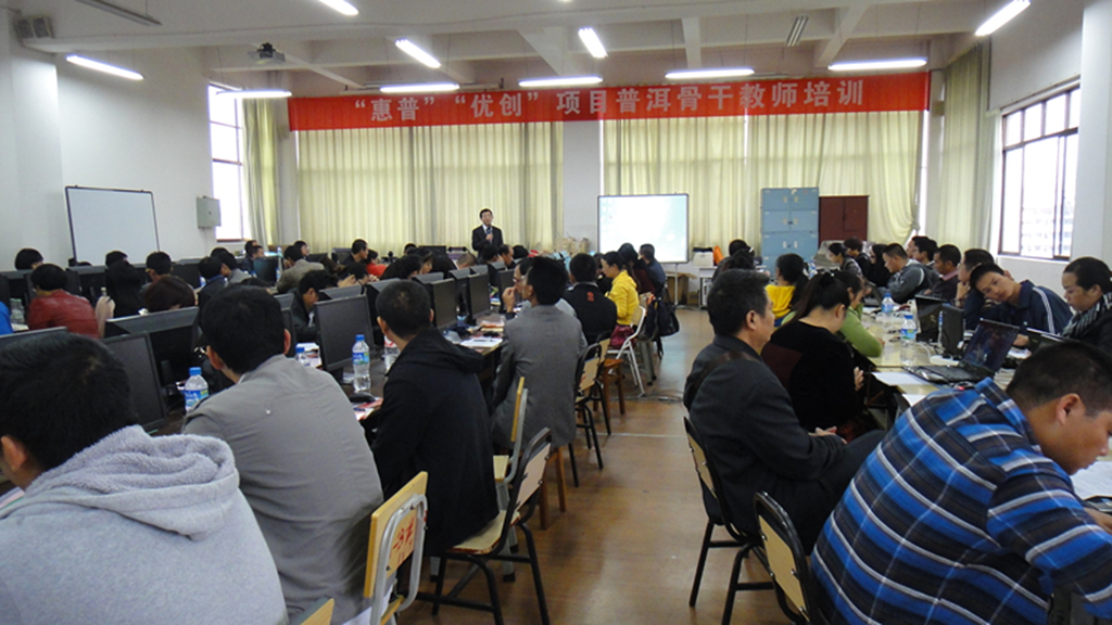此次培训为“优创”项目继杭州、成都骨干教师培训后的第三站培训。联合国教科文组织巴黎总部信息技术教育专家苗逢春博士、华南师范大学教育技术学院副院长赵建华教授、浙江大学教育学院院长助理阚阅博士、华南师范大学教育技术学院孔晶博士、中国教育科学研究院孟鸿伟博士、普洱市教育局副局长牛豫锐、普洱市电教馆馆长周建平面向来自普洱十个区县100余名骨干教师开展培训。培训为期五天,采用专题讲座、分组研讨、互动交流等形式,围绕“信息技术操作技能”,“信息技术与教学整合”以及“基于信息技术的学科教学设计”等专题开展。在相关部门的大力支持下,此次培训取得了预期的效果,受到普洱教育行政部门和参与培训教师的充分肯定。