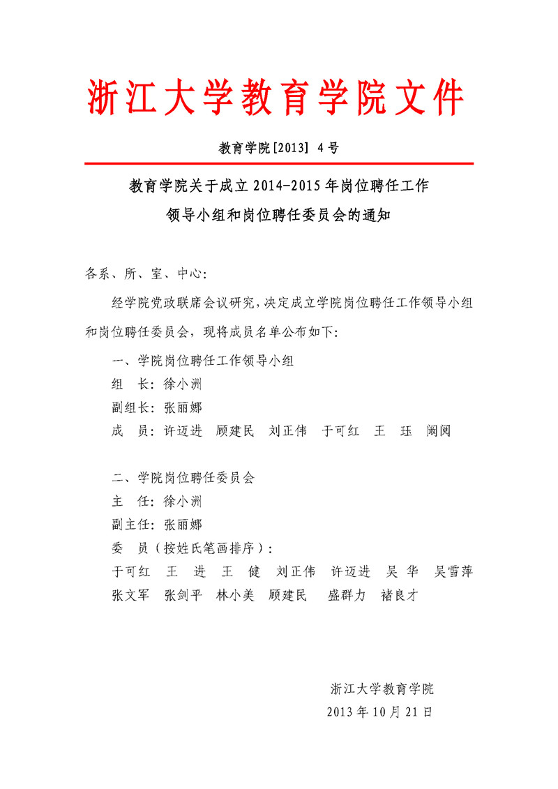 教育学院〔2013〕4号:教育学院关于成立2014-2015年岗位聘任工作领导小...